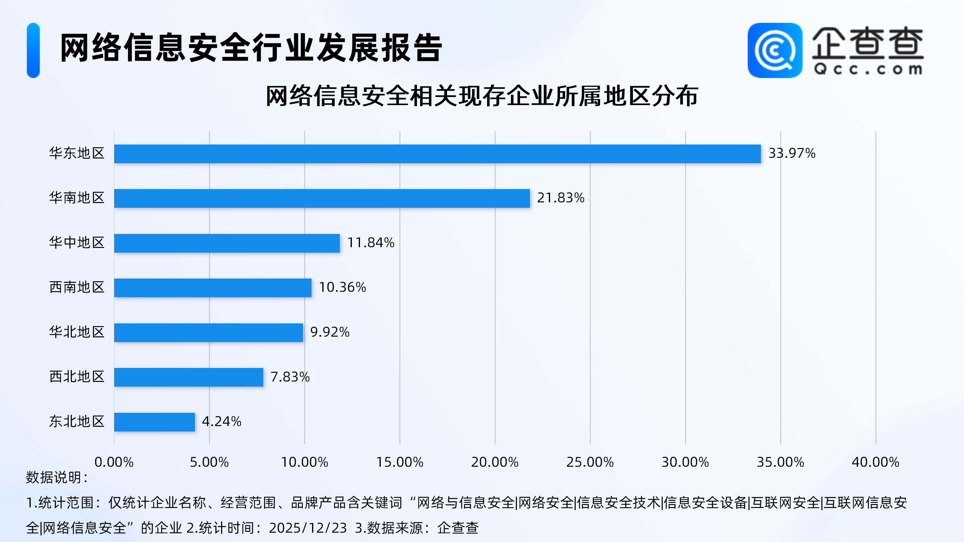 企查查数据显示,截至12月23日,国内现存网络信息安全相关企业达247.8万家。注册量方面,近五年网络信息安全相关企业年注册量整体呈上升趋势,2024年注册量达54.94万家,同比下降11.76%。截至目前,今年已注册66.01万家相关企业,已超去年全年注册水平,与2024年同期相比增长23.72%。2、相关现存企业主要分布在华东地区、华南地区